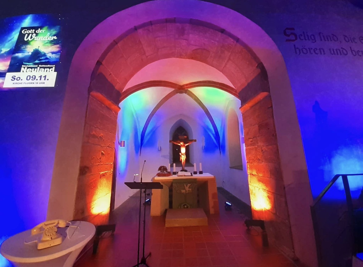 ... ist etwas vom Schönsten im Gemeindeleben. Wir treffen uns in der Regel am Sonntag um 10:00 Uhr in der Evangelischen Kirche Fluorn. Zu bestimmten Terminen feiern wir zusätzliche Gottesdienste zu anderen Uhrzeiten, wie z.B. den Neulandgottesdienst um 18:00 Uhr und die Motto-Kirche für Familien um 10:00 Uhr. Die Termine finden Sie in unserem Kalender.